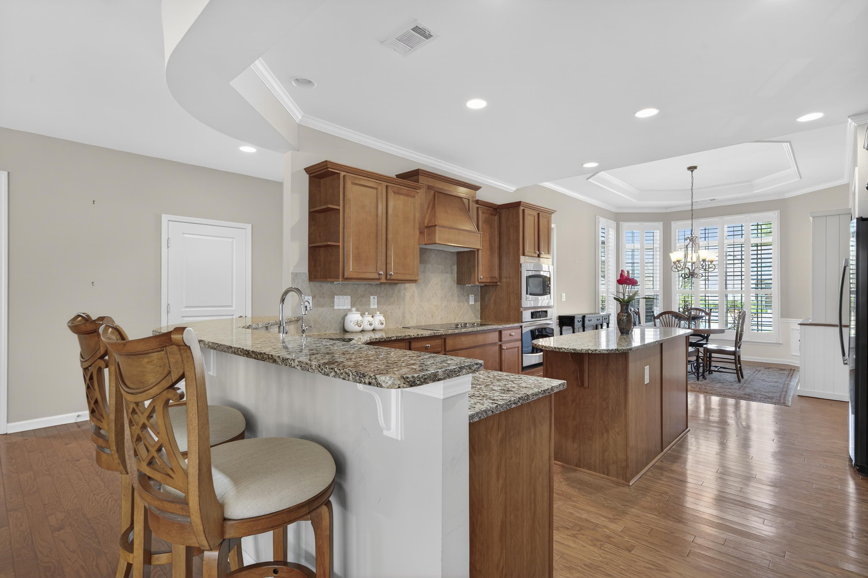 Breakfast Bar, Chair Rail, Closet System, Crown Molding, Double Vanity, Granite Counters, Kitchen Island, Pantry, Separate Shower, Solid Surface Counters, Tray Ceiling(s), Wainscotting, Walk-In Closet(s), Granite, Primary on Main
