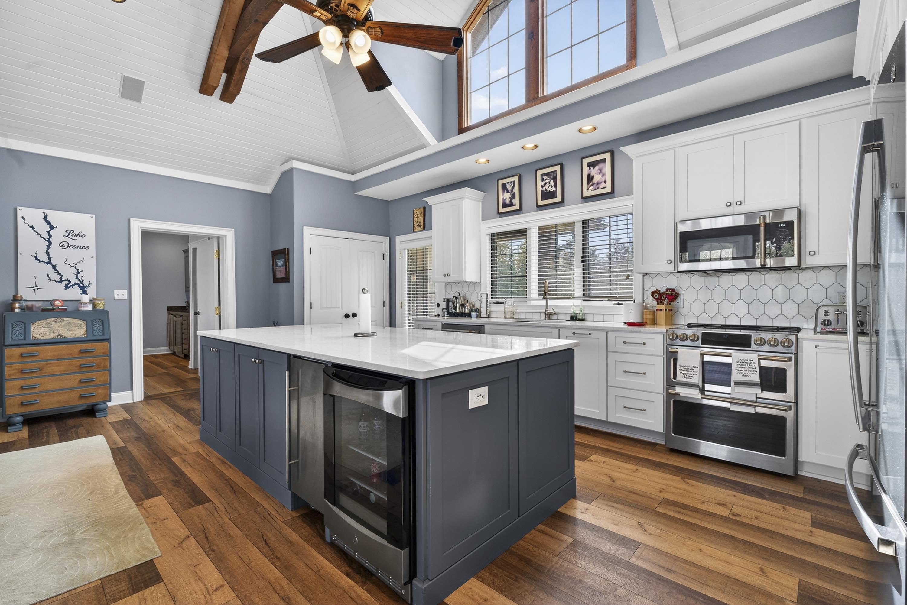 Lakefront Villa with Max Dock in Cuscowilla. Enjoy spectacular lake and golf course views from the lakeside covered porch of this beautifully maintained lakefront villa. This 3-bedroom, 3-bath ranch home sits on a level lot and features an open floor plan designed for effortless lake living and entertaining. The main living area flows seamlessly from the kitchen and great room to a spacious covered porch overlooking the lake. Perfect for year-round enjoyment, the porch features a masonry fireplace and built-in grill, creating an ideal outdoor living space. The main-level owner’s suite offers stunning lake views and includes a lockout design with a private sitting room, fireplace, wet bar, and separate entrance—perfect for guests or added privacy. Two additional oversized bedrooms easily accommodate two queen beds each, providing plenty of space for family and visitors. Below the porch, a large golf cart garage offers ample storage for lake toys and outdoor equipment. The new composite max dock includes a boat lift and cover, and the gentle walk to the water leads to a sandy beach area ideal for swimming and young children. Located just a short golf cart ride from the Cuscowilla clubhouse and golf course, this home offers the perfect combination of comfort, convenience, and lakefront lifestyle. A $40,000 Golf Membership credit is included in the price. The new triple pontoon boat , most furniture and the golf cart are available.