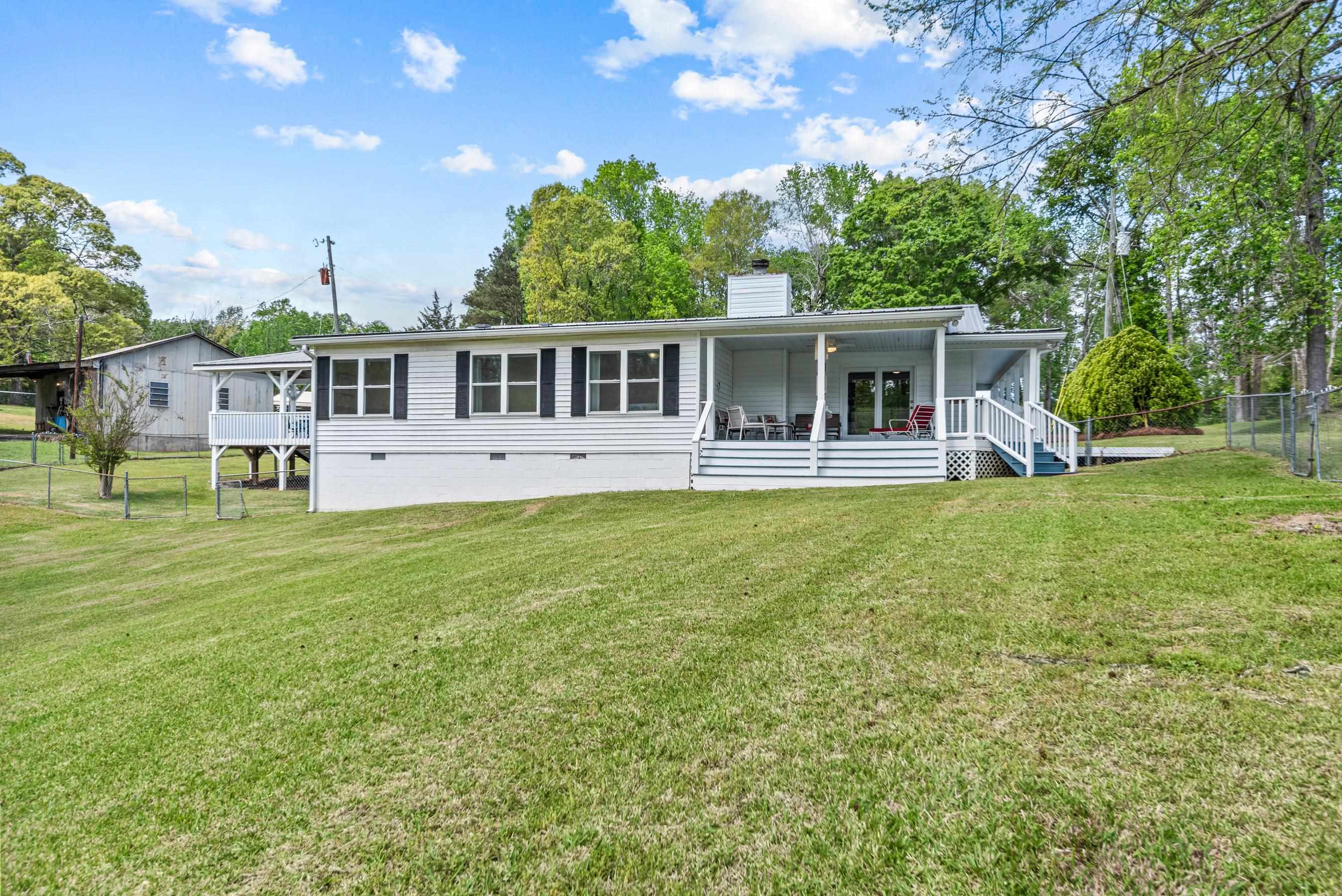This MINT CONDITION ONE LEVEL lake home with SEPARATE GUEST COTTAGE has it all! LOVED and clean as a whistle in IDEAL LOCATION - close to groceries, restaurants and shopping. 3 bedroom 2.5 bath with separate small office. Large freshly painted kitchen with abundance of cabinetry and 2 large pantries (one walk-in). Comfortable floor plan with emphasis on lakeside living - FOUR PORCHES! Cozy fireplace and storage galore. NEW METAL ROOF, NEW dual opening PELLA WINDOWS across the lakeside of the house. DOUBLE ATTACHED GARAGE WITH WORKSHOP AREA. Additional 1 bedroom 1 bath guest cottage with single attached garage is mostly complete and ready for your finishing touches. Concrete circular driveway. Close to an acre and fully fenced, this gives the ultimate pet/children lakeside experience! Above ground swimming pool with expansive NEW DECK and COVERED LAKESIDE PAVILION. Boathouse with new lift motor sits toward back of a cove for quiet lake living yet super close to big open water. DEEP DEEP WATER and on one of the best fishing holes around! Tons of successful fishing history off this dock! $100/year lease strip - no annual lease fees.
